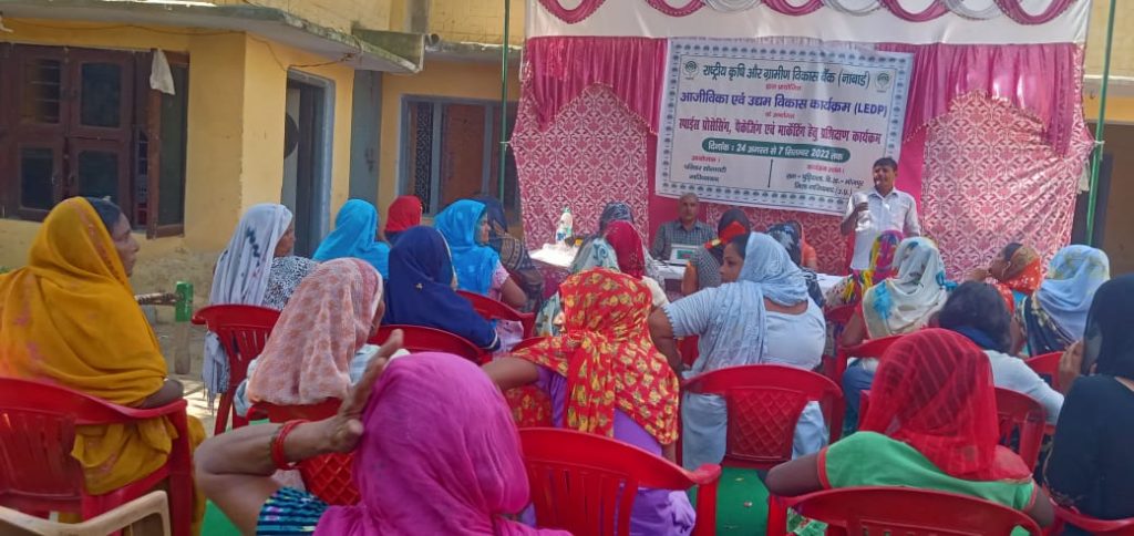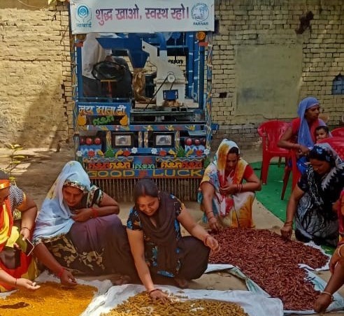Begmabad of Bhojpur block of Ghaziabad. Each cluster consists of 30 women. These clusters have been provided livelihood through spice processing and packaging. The processes in spice processing include Cleaning, Grinding, Blending, Sieving, Material Handling and Bulk Storage, Batch making up to packing ensuring high product quality and hygiene. The women sell the packaged goods through SHGs, exhibitions, melas and other platforms.